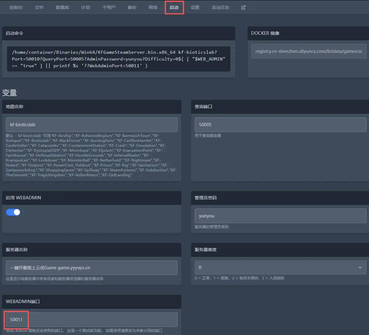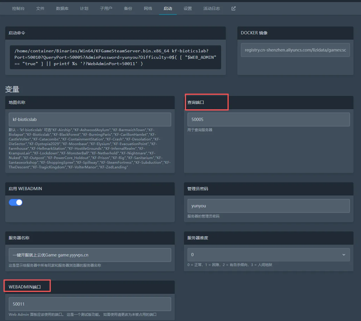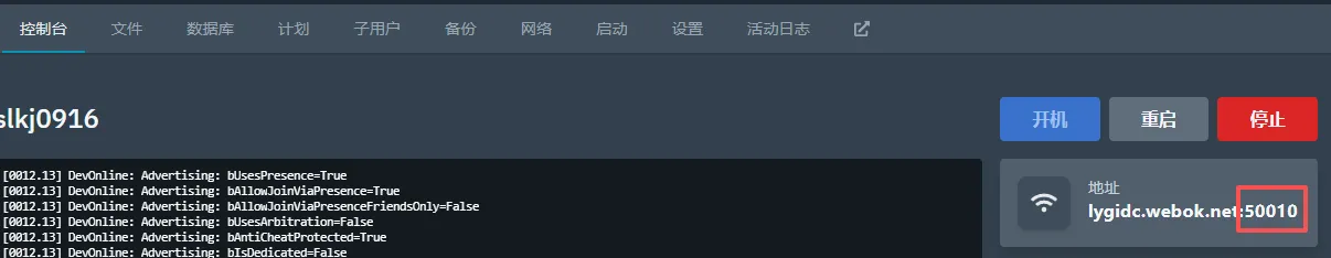 云优game 最低2H4G 硬盘:30G左右 端口:3个 面板配置 复制第二个和第三个端口,分别粘贴到查询端口和WEBADMIN端口 填写我们分类好的端口和相关服务器信息,返回控制台,点击右上方的重启按钮 等待服务器转换为running,显示正常运行时间即为成功启动,参考下图 WebAdmin端口管理网页 把地址的端口改成WEBADMIN设置的端口即可 使用地址的IP+启动页面里面设置的WEBADMIN端口在浏览器打开即可 登录用户名admin 密码是面板设置的管理员密码