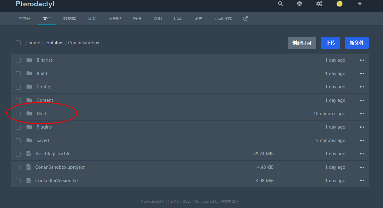 在服务器文件目录/home/container/ConanSandbox创建Mod文件夹